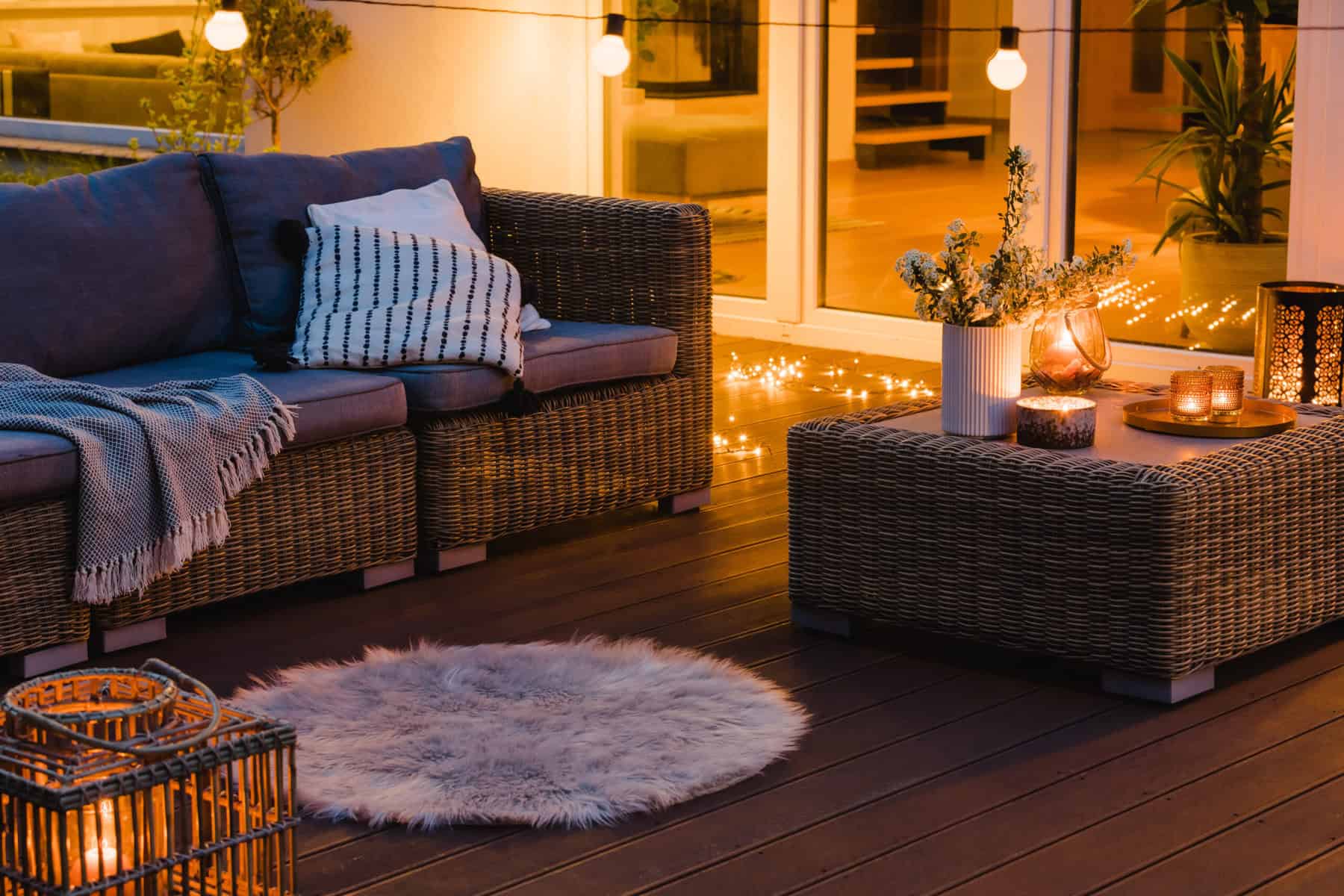 String lights offer a budget-friendly way to enhance your space while making it feel comfortable and stylish. For a more built-in, polished look, consider permanent lighting solutions integrated into your deck or patio.